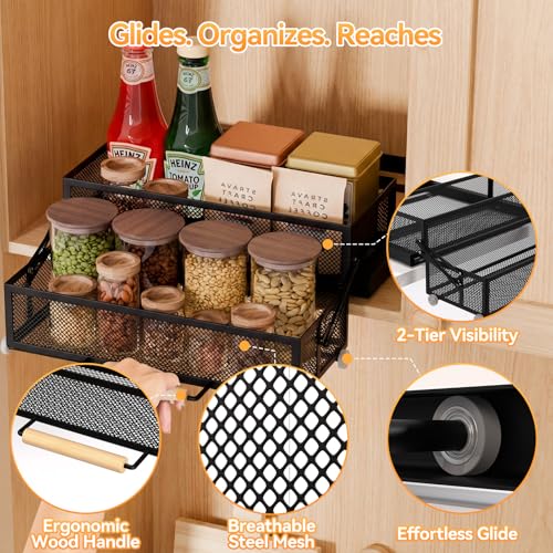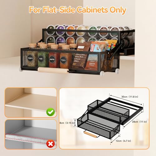 HOUSE AGAIN Pull Out Cabinet Organizer, Recessed 2-Tier Drop Down Storage for High/Deep Cabinets, Compact 12-Inch Hidden Organizer for Spices, Snacks and Small Bottles (Black)