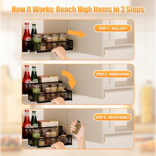 【Smooth, Sturdy & Built for High Cabinets】Engineered for safe daily use in overhead and deep storage spaces. Its reinforced steel frame holds up to 5 kg (11 lbs) securely, while the smooth-gliding, controlled drop-down mechanism prevents sudden shifts. Enjoy stable, reliable access to spice jars, vitamin bottles, and small essentials, with no shaky shelves