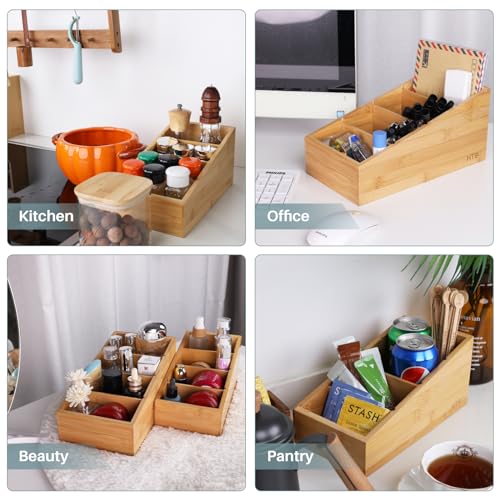 HTB 4-Section Snack Organizer with Removable Dividers for Kitchen, Cabinet, Office, Countertop, 2 Pack Bamboo Pantry Storage Organization for Spice Packets, Seasoning Pouches, Coffee Pods