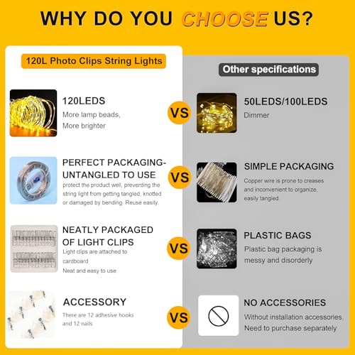 Upgrade 120LED Photo Clips String Light: Our Copper Wire Fairy String Light have 120LED; Total 40ft long with extra 10ft long power cord; And 10cm distance between LED bulbs, allowing you to free adjustment any sizes on the led string lights for picture