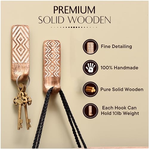 Indian Shelf Boho Decorative Wood Adhesive Wall Hooks for Coats – 3 Hooks 6 Strips, Waterproof, Rustproof Towel Holder, No-Drill Hangers for Bathroom & Kitchen – Cute Key Holder for Wall