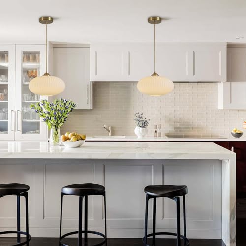 Unique Ribbed Glass: The white kitchen lighting fixtures ceiling is made of brass gold finishing metal and milk white glass globe shade, milk white hand-blown glass with ribbed texture looks very special and creative, the round metal canopy is painted to be antique brushed brass gold to add a sense of luxury