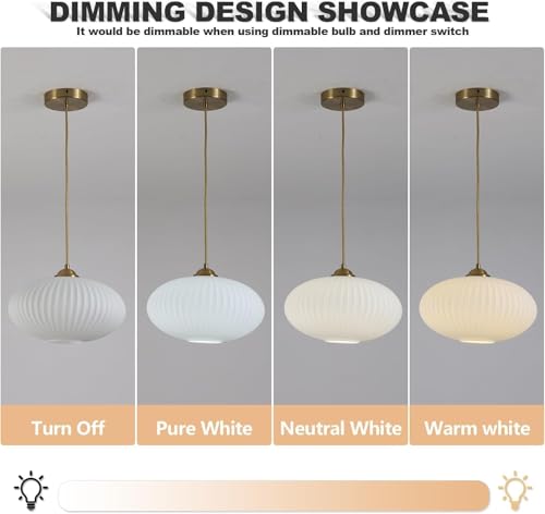 Milk Glass Pendant Light Size: The modern white and gold pendant light width: 9.8”(25cm), height: 6.7”(17cm), canopy: 4.7”(12cm). Light source: E26 base (bulb not included) (bulb replacement ASIN: B081WVNCVM), voltage: 110-220V for worldwide. The white pendant light can be dimmable when work with dimmable bulb and switch