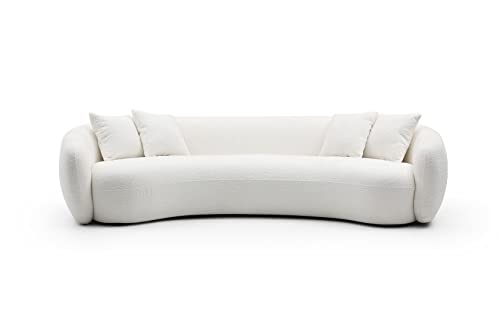 KEIKI 103″ Boucle Half Moon Curved Sectional Sofa with 4 Throw Pillows, Modern Style 5-Seater Teddy Fleece Leisure Couch with Curved Backrest, Easy Assembly, for Apartment, Living Room, Bedroom, White