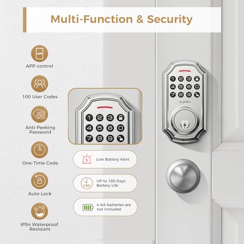 𝐊𝐞𝐲𝐥𝐞𝐬𝐬 𝐄𝐧𝐭𝐫𝐲 𝐃𝐨𝐨𝐫 𝐋𝐨𝐜𝐤: Arpha smart door lock could be unlocked via App + Password + EKey + Mechanical key. Smart deadbolt supports 100 groups of access codes for the front door, including 97 users and 3 admin passcodes. Everything you need in 1 safe and secure smart lock.