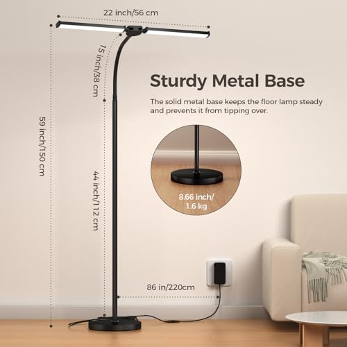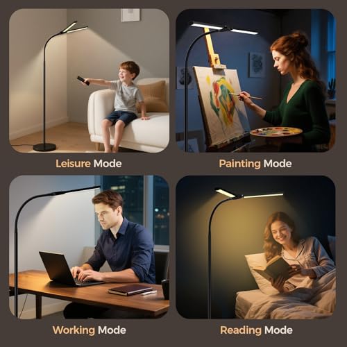 Super Bright Dual-Head Design & Eye-Caring: Our LED floor lamp features an adjustable dual-head design that rotates up to 180°, delivering brighter light and wider coverage than typical floor lamps. Easily switch between broad room illumination or focused task lighting for reading, work, and crafts. It emits soft, flicker-free light with reduced blue light for gentle, even brightness that significantly minimizes eye strain during extended use.