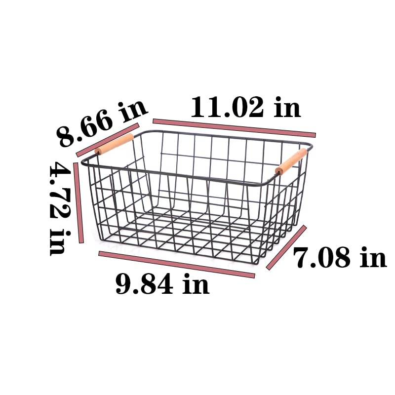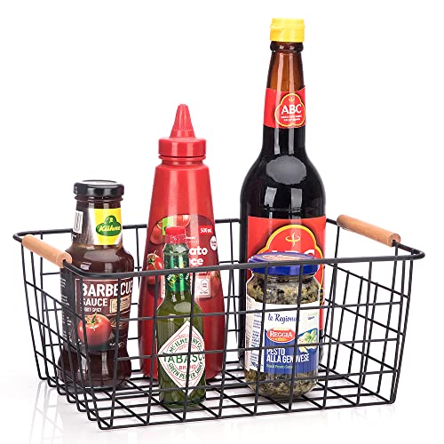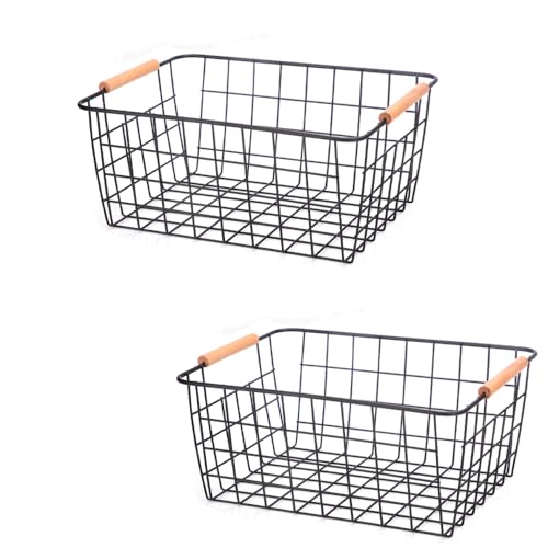 LeleCAT Wire Baskets with Wooden Handles Wire Storage Organizer Bin Baskets, Pantry, Closets, Bedrooms – Set of 2(Black)