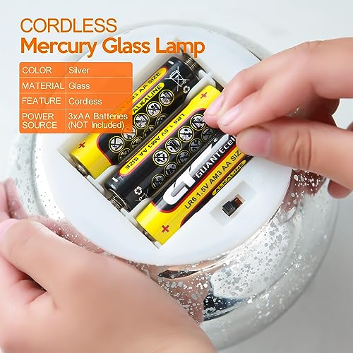 Lighted Mercury Glass Ball Table Lamp, Silver Cordless Glass Orb Christmas Decor Ball Led Light Globe, Modern Light Up Battery Operated Sphere Night Light for Home Bedroom Indoor Decor, Middle