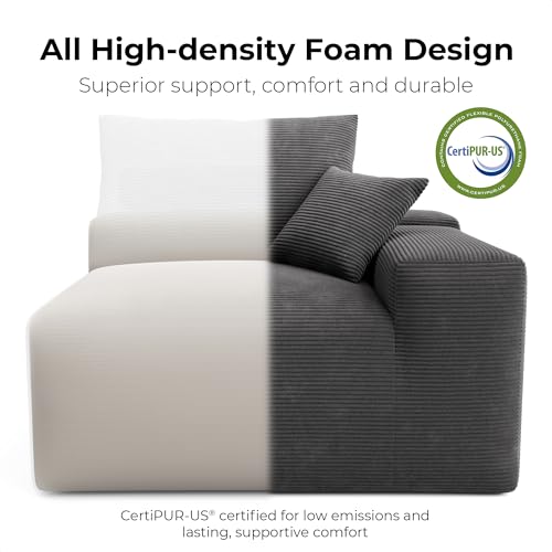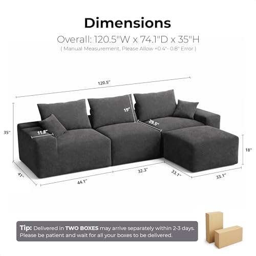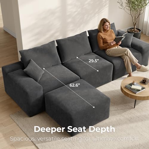 LIKIMIO 120″ Modular Sectional Sofa with Ottoman, Oversized Deep Seat Boneless Couch, Corduroy Upholstery, No Assembly Required, Modern L-Shaped Living Room Sofa, Dark Grey