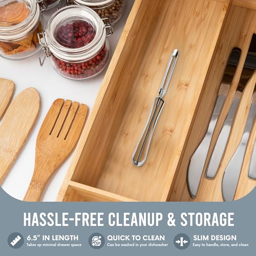 No-Hassle Cleanup: Bulky, hard-to-clean kitchen products take the fun out of cooking. But because it’s safe in the dishwasher, our peeler couldn’t be easier to clean! At only 6.5” in length, it occupies minimal drawer space for effortless storage and organization.