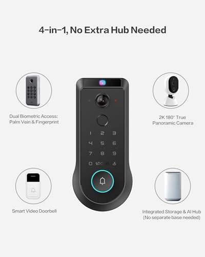 [4-in-1, No Separate Base Required] Seamlessly combines palm vein & fingerprint smart lock, crystal-clear 2K 180° true panoramic camera, smart video doorbell with night vision, and built-in AI hub with 32GB local storage, no extra hub needed, no monthly fee.