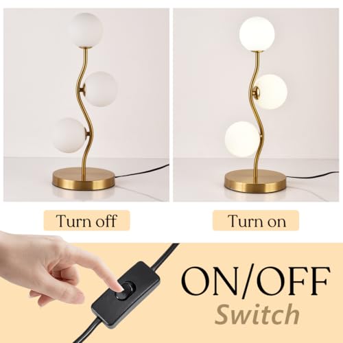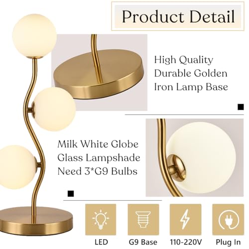 Mid Century Gold Globe Table Lamp 3-Light Flower Curve Beside Desk Table Light with Milk White Glass Shade Metal Base Nightstand Lamp for Bedroom Bedside