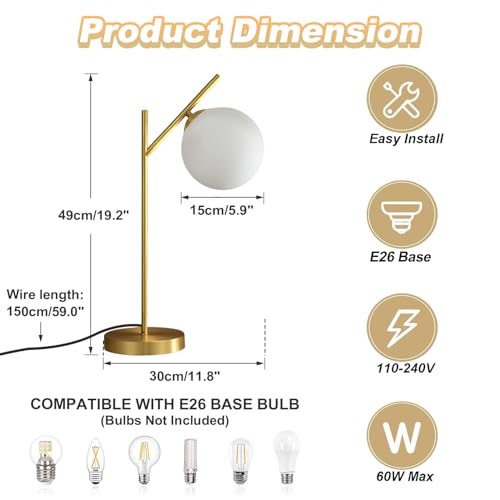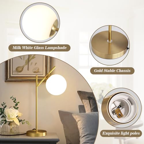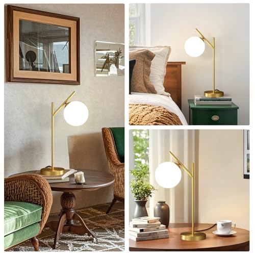 Mid Century Modern Table Lamp, 1 Light Brass Glass Globe Bedside Lamp, Contemporary Metal Table Lamp with Milky White Glass shadefor Bedroom Living Room Study Room