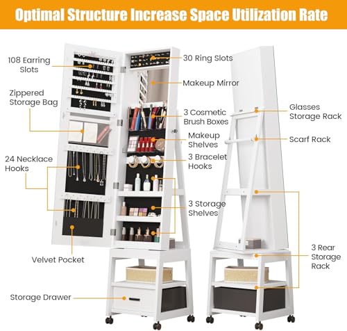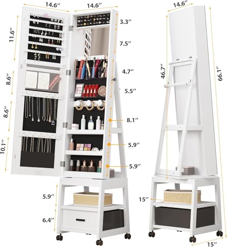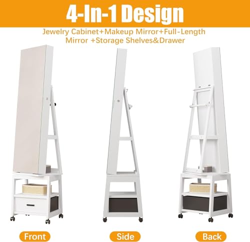Mirror Cabinet with Storage Swivel Jewelry Armoire Standing with Full-length Mirror Reversible Storage Mirror Jewelry Organizers with 1Drawer and Wheels White