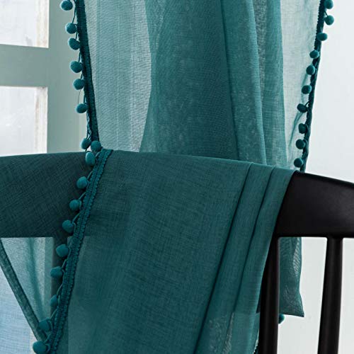 MISS SELECTEX Linen Look Pom Pom Tasseled Sheer Curtains – Rod Pocket Voile Semi-Sheer Curtains for Living and Bedroom, Set of 2 Curtain Panels (52 x 84 inch, Teal)