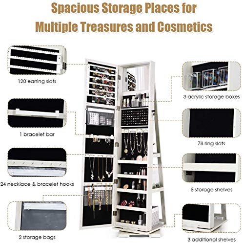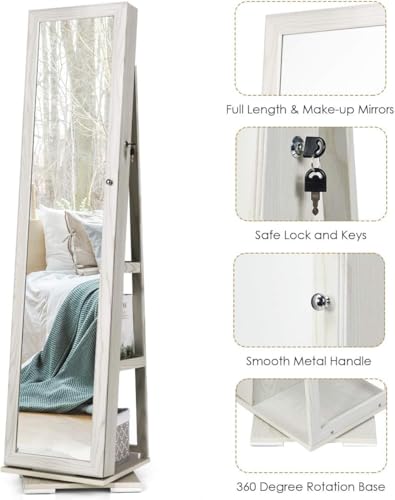 Moccha 2-in-1 Mirrored Jewelry Cabinet, 360 Rotating Free Standing Jewelry Armoire, Lockable Large Capacity Jewelry Organizer w/Full Length Mirror, Inside Makeup Mirror (White)