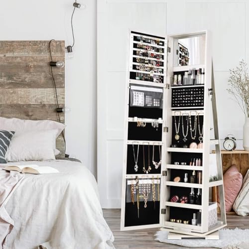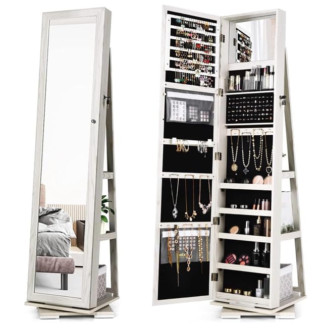 Full-Length Mirror & Built-in Mirror: This jewelry armoire equipped with an external full length mirror, which offers a head-to-toe view of your outfit, and a built-in mirror is convenient for you to choose beautiful jewelry or to make up in front of the standing jewelry storage.