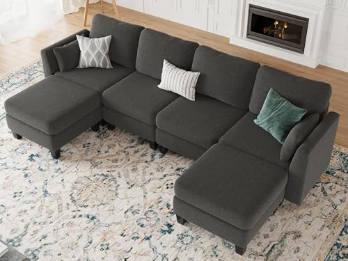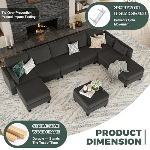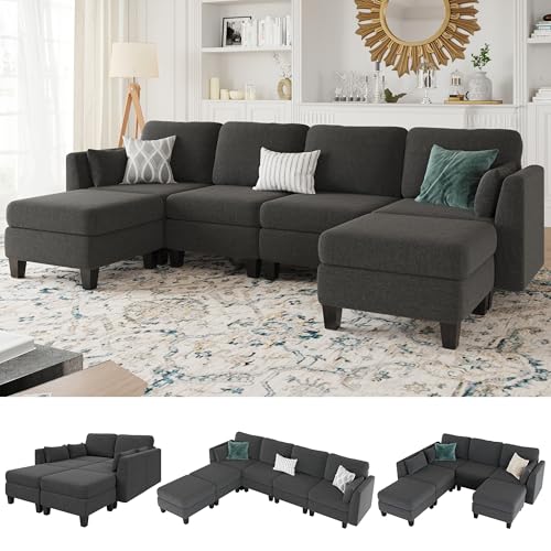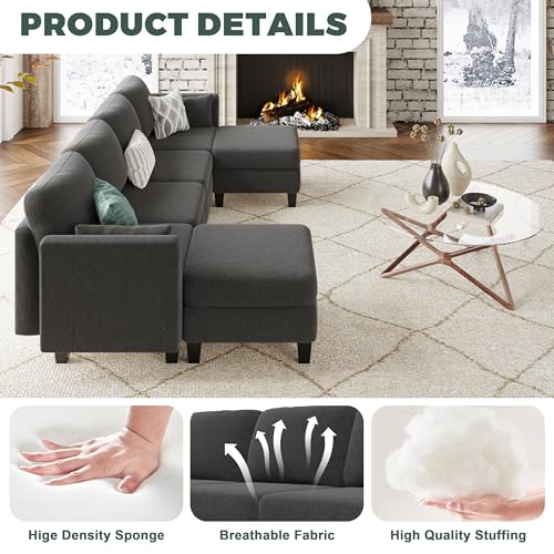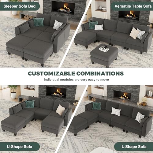 Modular Sectional Sofa, 6 Seaters Modular Sleeper Sofa Couch, Comfy Sectionals Couches Bed, Convertible Sofas with Ottomans, Sectional Couches for Living Room, Dark Grey