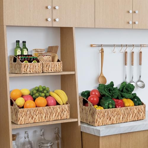 Ollieroo Natural Water Hyacinth Storage Baskets, Handwoven Wicker Storage Bins with Built-in Handles, Storage Container Baskets for Shelves, Bedroom, Bathroom, Laundry Room or Kitchen(Set of 3)