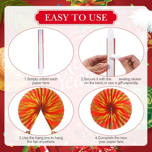 Easy to Assemble: you simply unfold each Chinese new year fans and secure with the adhesive sticker on the back of it, or use a gift paperclip; And there is also a hang line on each paper fan that allows you to hang it anywhere