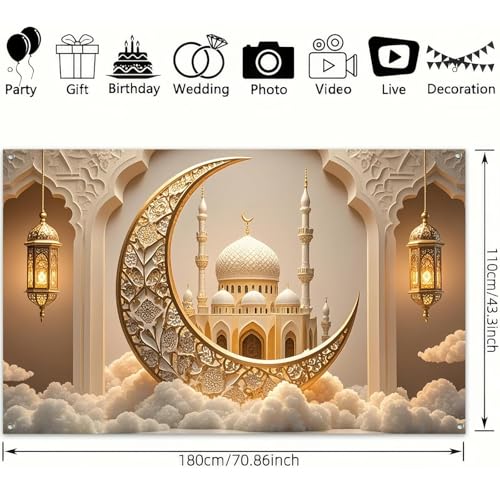 Ramadan Decorations Islamic Crescent Moon Mosque Backdrop Eid Mubarak Banner Muslim Home Decor Ramadan Kareem Lantern Sign Iftar Party Supplies Background Wall Art