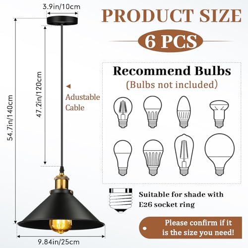 Retisee 6 Pieces Industrial Pendant Lights E26 E27 Base Black Farmhouse Lampshade for Hanging Light Vintage Metal Shade Fixtures Barn for Kitchen Dining Room Home Bar Foyer