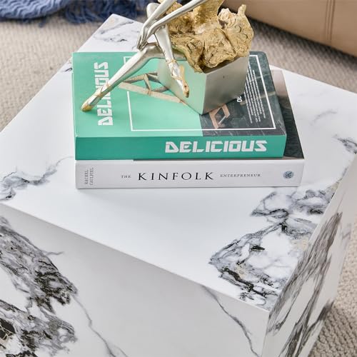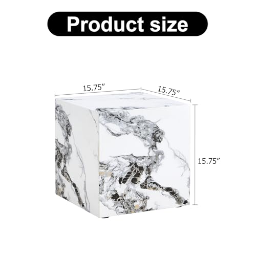 MDF SOFA TABLE: The MDF frame provides essential stability and strength, ensuring a reliable surface for placing items without any wobbling. The use of MDF material, coupled with a faux marble finish process, not only contributes to its attractive appearance but also guarantees superior durability. The inclusion of foot pads prevents slips and protects your floor from scratches.The cube faux marble end table can hold up to 100 Lbs
