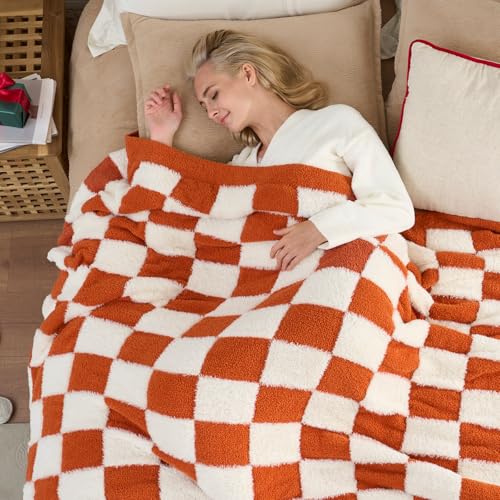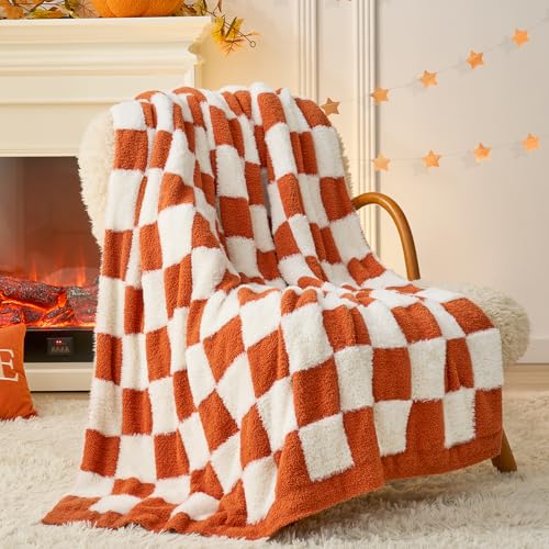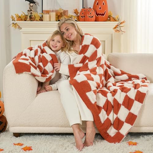 Snuggle Sac Orange Throw Blanket for Fall,Soft Fall Checkered Blanket for Couch, Cozy Faux Fur Knit Microfiber Blankets for Sofa, Bed, Orange Checker,50×60 inches