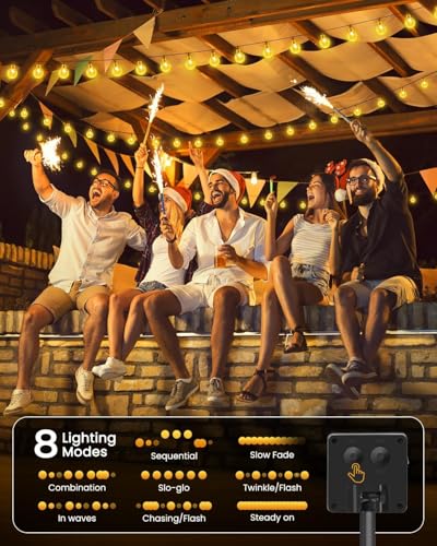 【8 Different Modes & Memory Function】The solar patio lights features 8 different lighting modes: In waves, Combination, Sequential, Slo-glo, Chasing/Flash, Slow Fade, Twinkle/Flash and Steady On. Built-in memory chip to save your last mode setting. Perfect for various occasions and events, including Christmas, holidays and parties;