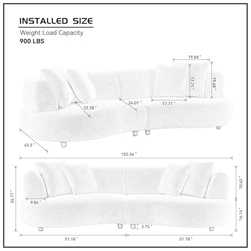 【Durable Build, Simple Assembly】 The curved sofa is supported by a solid wood and plywood frame with strong legs that protect your floor. Delivered in two boxes, it only requires an easy leg installation before use — simple and convenient.