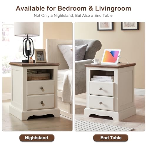 T4TREAM Nightstand with Charging Station, 18 Inch Vintage End Table with 2 Drawers, Wood Rustic Sofa Side Table with Open Storage Shelf for Bedroom, Living Room, Antique White