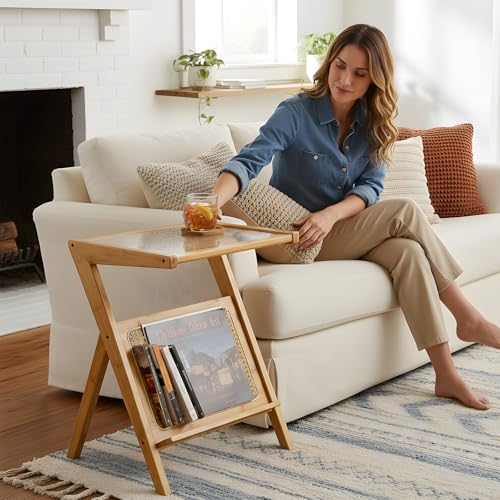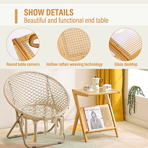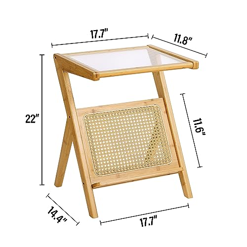 Tiita Rattan Side Table, Mid Century Nightstand, Bamboo Accent Bedside Tables, Glass Coffee Tables, Boho Wooden End Table with Storage for Small Space, Living Room and Bedroom