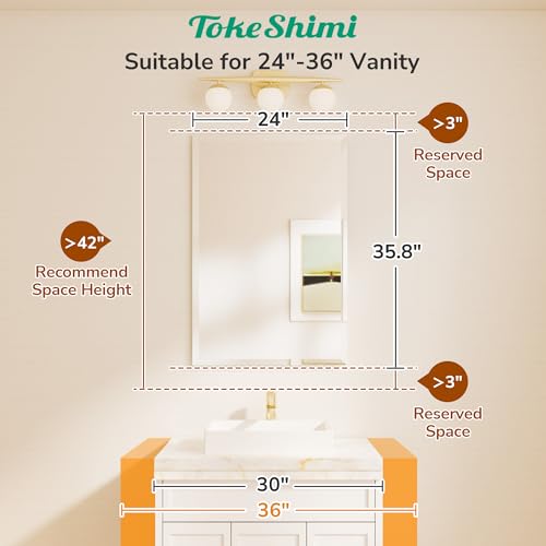 TokeShimi 24×36 Beveled Wall Mirror Decorative, Bathroom Vanity Mirrored with 1″ Beveled Edge, Shatterproof Modern Frameless Mirror Bathroom Rectangle for Living Room, Entryway, Restroom