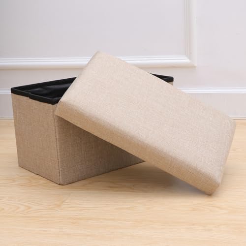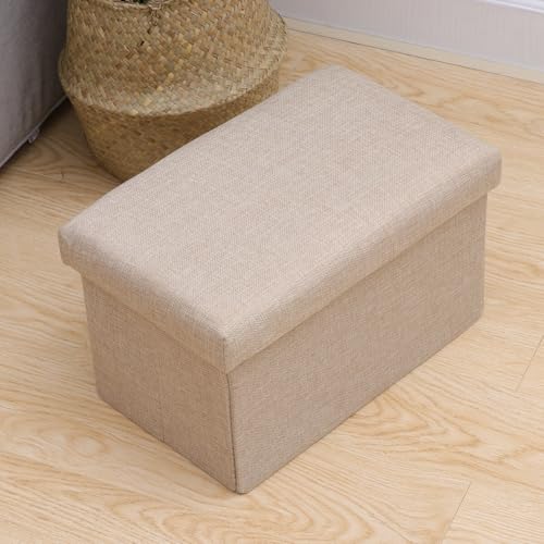 Veemoon Foldable Linen Fabric Storage Box with Lid Multipurpose Chest and Shoe Bench Ottoman for Bedroom and Living Portable Collapsible Beige Foot Rest for Home and Travel