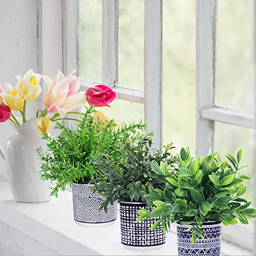 Winlyn Set of 3 Small Potted Plants Artificial Eucalyptus Rosemary Boxwood Plants in Black and White Geometric Pots for Table Centerpiece Kitchen Counter Windowsill Indoor Outdoor Garden Greens Decor